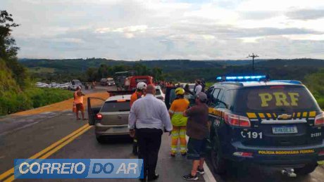 Grave acidente de trânsito entre quatro veículos deixou sete pessoas feridas e provocou a interdição total da BR-376 por mais de duas horas, na tarde de quarta-feira (31), no quilômetro 341 da rodovia, em Ortigueira, nos Campos Gerais do Paraná.