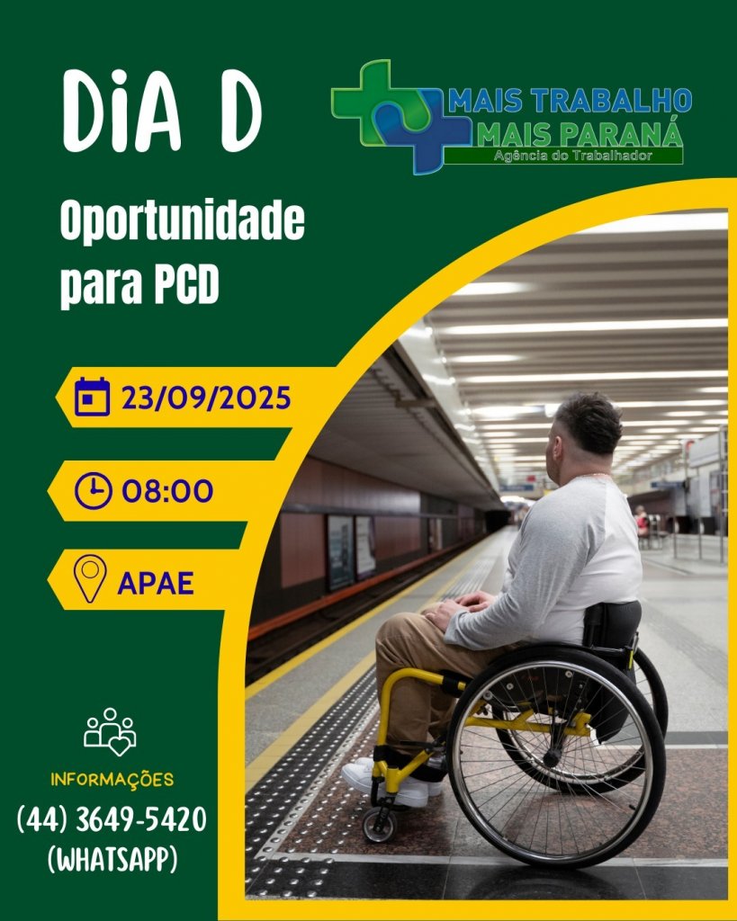 A Prefeitura de Palotina, por meio da Agência do Trabalhador, realizará no dia 23 de setembro, a partir das 08h, o Dia D, uma ação especial voltada à inclusão de Pessoas com Deficiência (PCD) no mercado de trabalho.