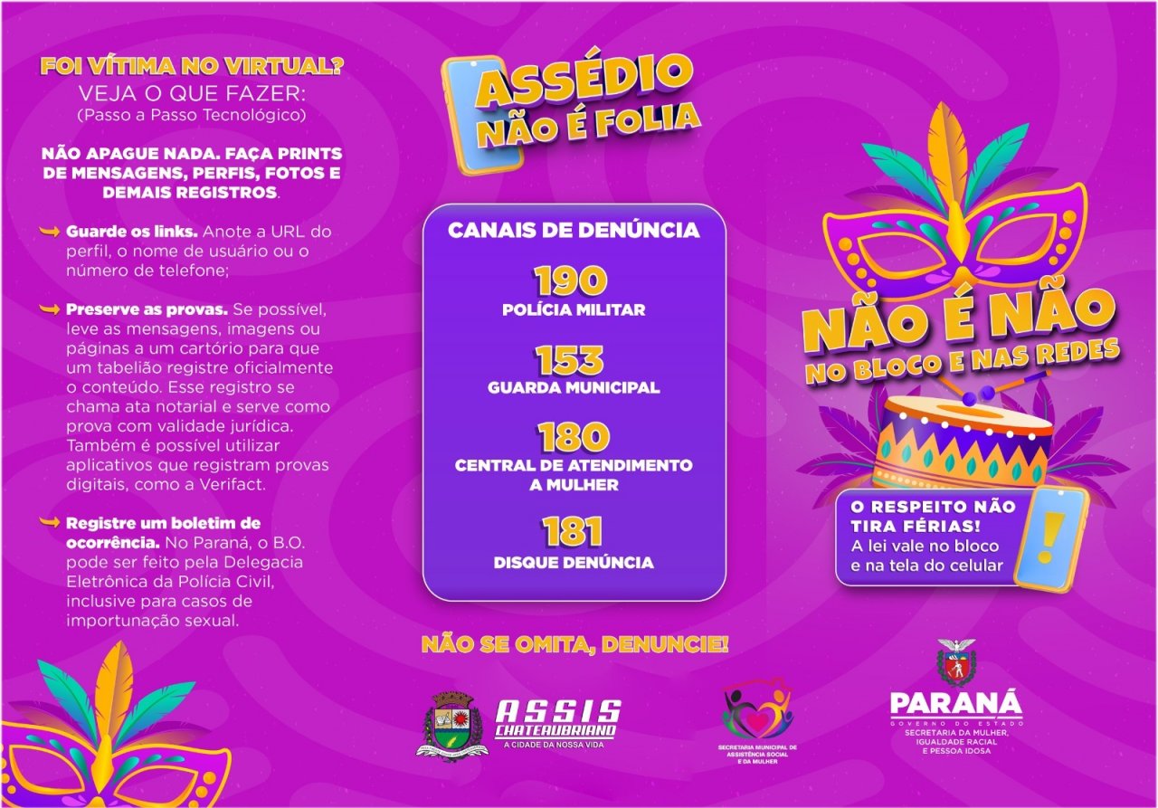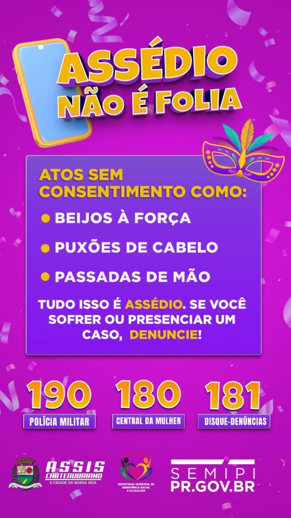 O Município de Assis Chateaubriand, por meio da Secretaria Municipal de Assistência Social e da Mulher, compreendendo a importância de se combater todas as formas de violência aderiu a Campanha Não é Não e convida toda a comunidade para apoiar essa causa, não somente no período de Carnaval, mas durante todo ano, criando uma cultura de paz e respeito.