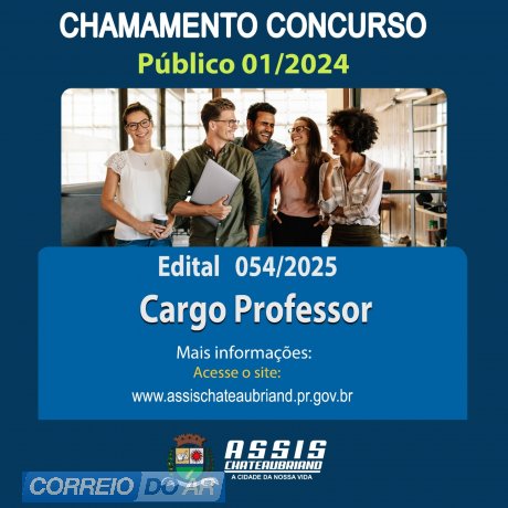 Publicado nesta quarta-feira (24), em diário oficial do município de Assis Chateaubriand, o edital 054/2025, tratando-se da vigésima quinta convocação de candidato habilitado no concurso público 01/2024, visando à nomeação no cargo Professor