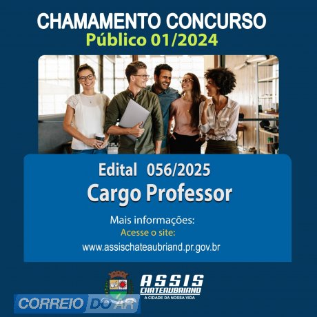 Publicado nesta quarta-feira (14), em diário oficial do município de Assis Chateaubriand, o edital 056/2025, tratando-se da vigésima sétima convocação de candidato habilitado no concurso público 01/2024, visando à nomeação no cargo Professor.