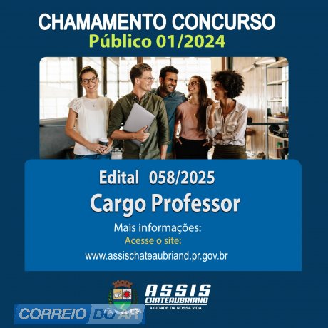 Publicado nesta terça-feira (4), em diário oficial do município de Assis Chateaubriand, o edital 058/2025, tratando-se da vigésima nona convocação de candidato habilitado no concurso público 01/2024, visando à nomeação no cargo de Professor.