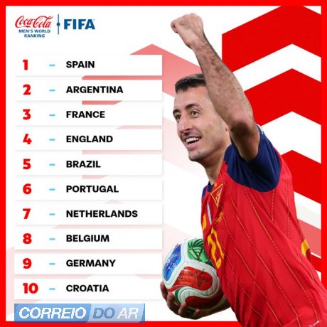 A 4ª colocada é a Inglaterra, enquanto Portugal (6ª), Holanda (7ª), Bélgica (8ª), Alemanha (9ª) e Croácia (10ª) completam o Top 10.