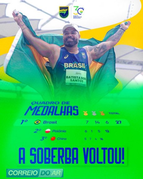 Com direito a três ouros, o Brasil somou, nesta terça-feira (30), mais 14 medalhas no Mundial de atletismo em Nova Déli (Índia). Com isso, a delegação brasileira permanece na liderança do quadro de medalhas da competição, com o total de 27 pódios (sete ouros, 14 pratas e seis bronzes).