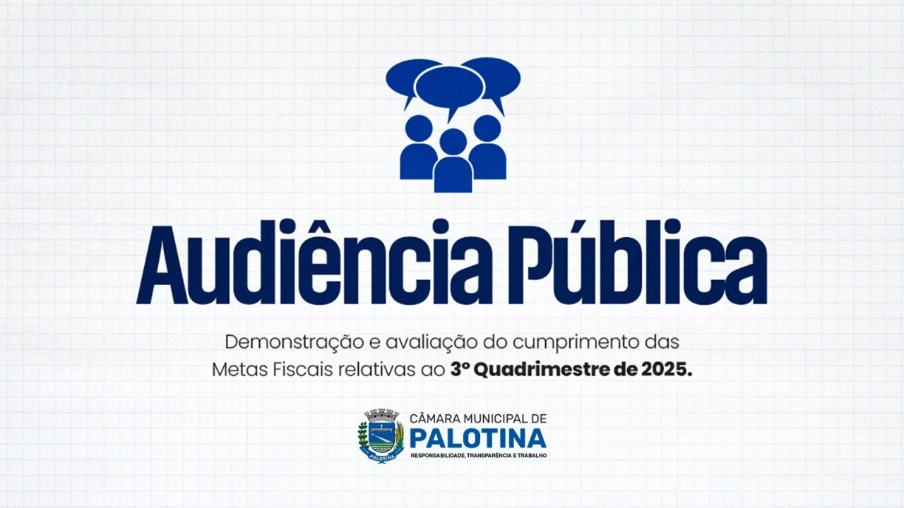 A Câmara Municipal de Palotina realizará na próxima quarta-feira, dia 26 de fevereiro de 2026, uma Audiência Pública para apresentação e avaliação das metas fiscais referentes ao 3º quadrimestre de 2025. O encontro terá início às 14h, no plenário do Legislativo municipal.