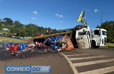 Caminhão com bebidas tomba em guincho e espalha carga em trevo em Clevelândia