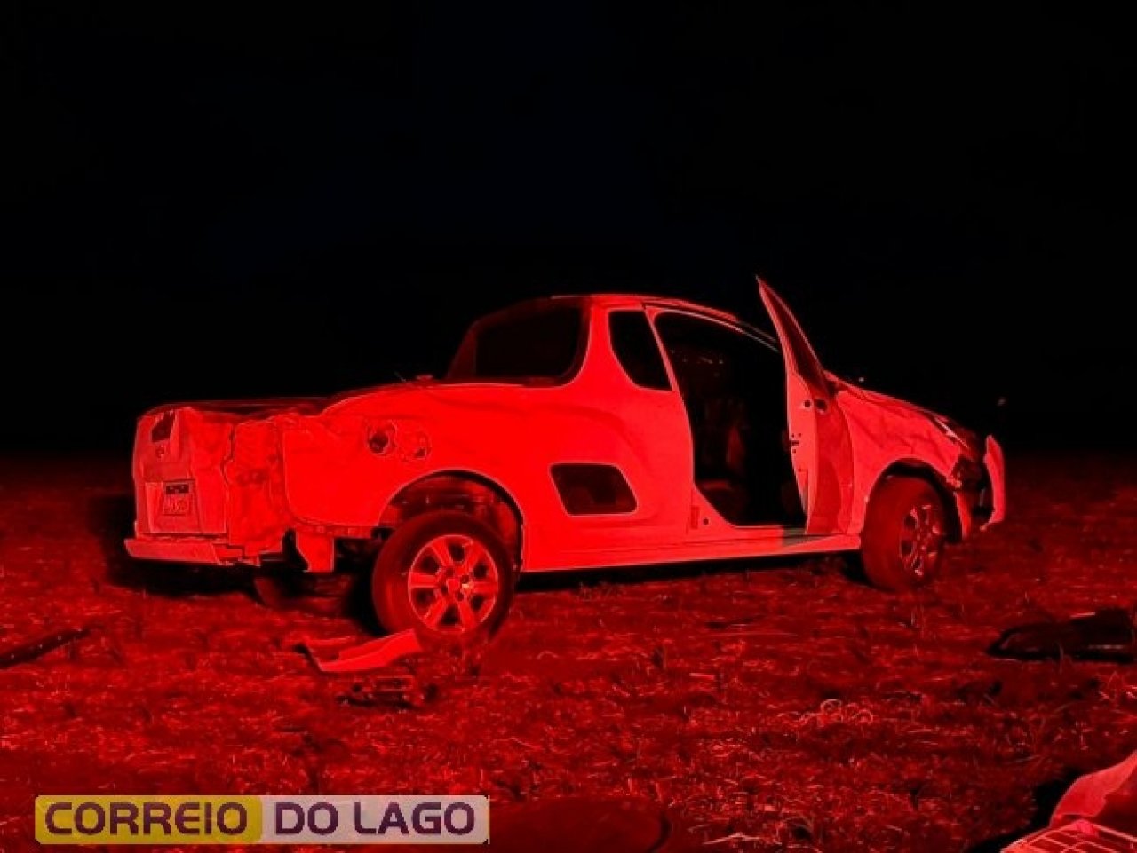 Logo atrás, uma GM Montana passou pelo trecho onde a pista estava suja. O motorista perdeu o controle da direção e acabou capotando o veículo, que parou em uma lavoura às margens da rodovia.