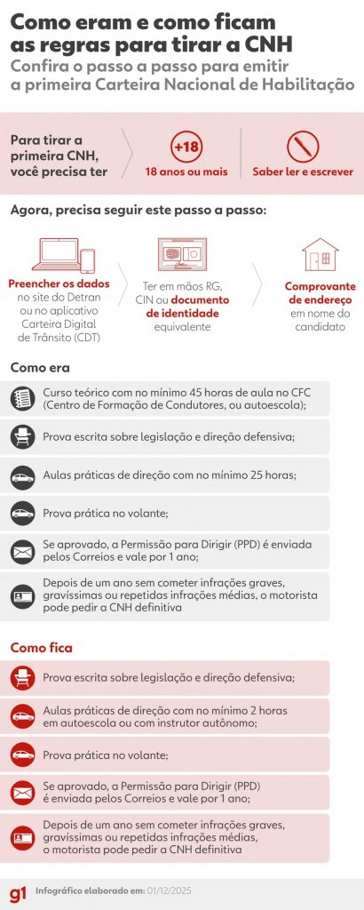 O ministro dos Transportes, Renan Filho (MDB), afirmou que as novas regras para obtenção da Carteira Nacional de Habilitação (CNH) começam a valer nesta semana. Entre as alterações, estão o fim da exigência de aulas obrigatórias em autoescolas e a renovação automática e gratuita do documento para motoristas classificados como "bons condutores" (mais detalhes abaixo).