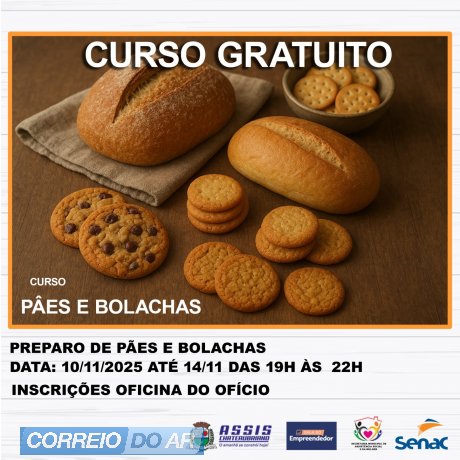 O curso será realizado no período noturno, das 19h às 22h, totalizando uma carga horária de 15 horas. A capacitação será conduzida por um instrutor qualificado do SENAC, garantindo ensino de qualidade e técnicas atualizadas para o preparo de pães e bolachas.