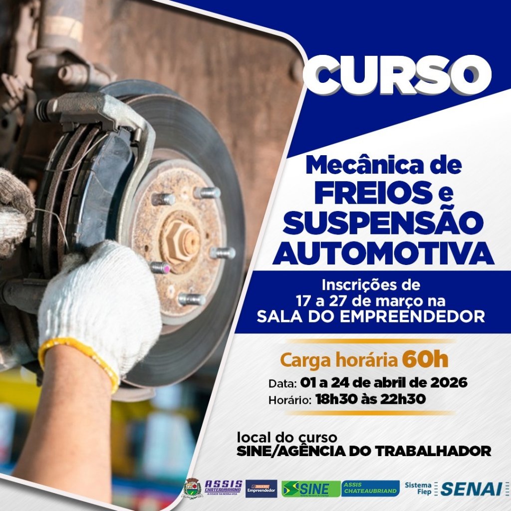 As inscrições para o curso de Mecânica de Freios e Suspensão Automotiva estão oficialmente abertas e podem ser realizadas na Sala do Empreendedor até o dia 27 de março ou enquanto houver vagas disponíveis. A iniciativa é uma parceria entre o município e o Serviço Nacional de Aprendizagem Industrial (SENAI), sendo oferecida gratuitamente à população.
