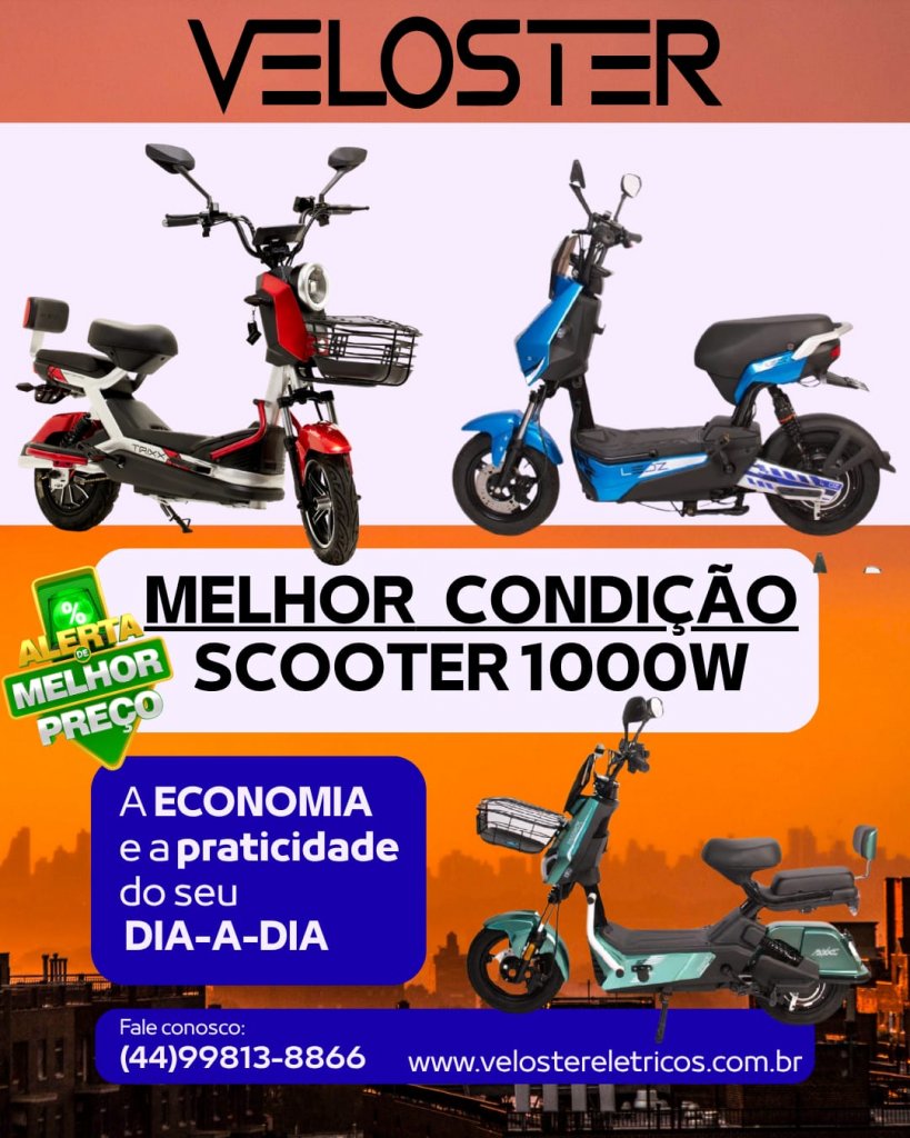A Veloster Palotina traz uma oportunidade única para quem deseja mobilidade elétrica com desempenho e economia: a scooter 1000W está disponível com preço imbatível e condições de pagamento especiais.