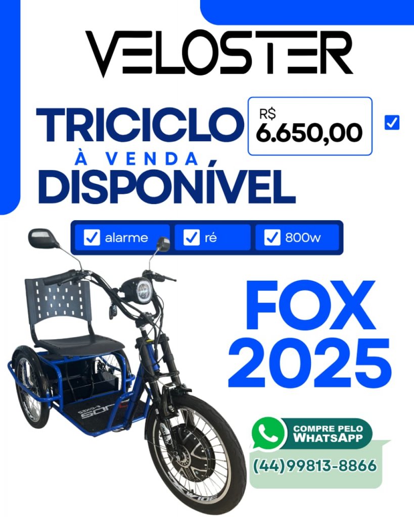 A Veloster Palotina apresenta o Triciclo Fox 2025, a solução perfeita para quem busca praticidade, conforto e economia no dia a dia. Ideal para transporte urbano, lazer ou necessidades especiais, o modelo oferece desempenho confiável e segurança.