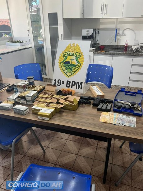 Na sequência, em diligência na residência do abordado, os policiais localizaram três armas de fogo escondidas dentro de um micro-ondas, sendo uma pistola calibre .22 e duas pistolas calibre 9mm. Também foram apreendidos R$ 2.200,00 em dinheiro e um aparelho celular.
