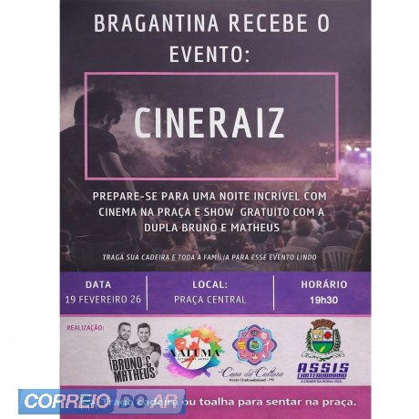 Nesta quinta-feira, 19 de fevereiro, o distrito de Bragantina recebe uma programação cultural imperdível. O evento Cineraiz, promovido por meio de parceria entre Prefeitura Municipal de Assis Chateaubriand, Casa da Cultura, dupla Bruno e Matheus e Maluma Centro de Artes, acontecerá às 19h30 na Praça Central de Bragantina.