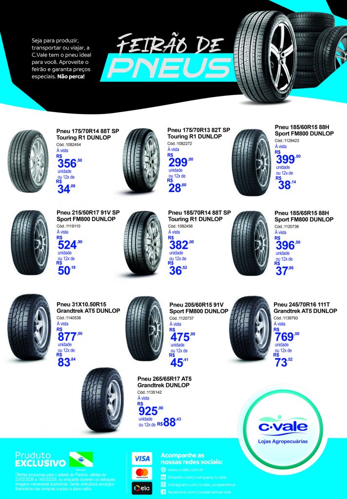 A C.Vale está com preços especiais em pneus Dunlop durante o Feirão de Pneus, que vai até sábado, 14 de março.