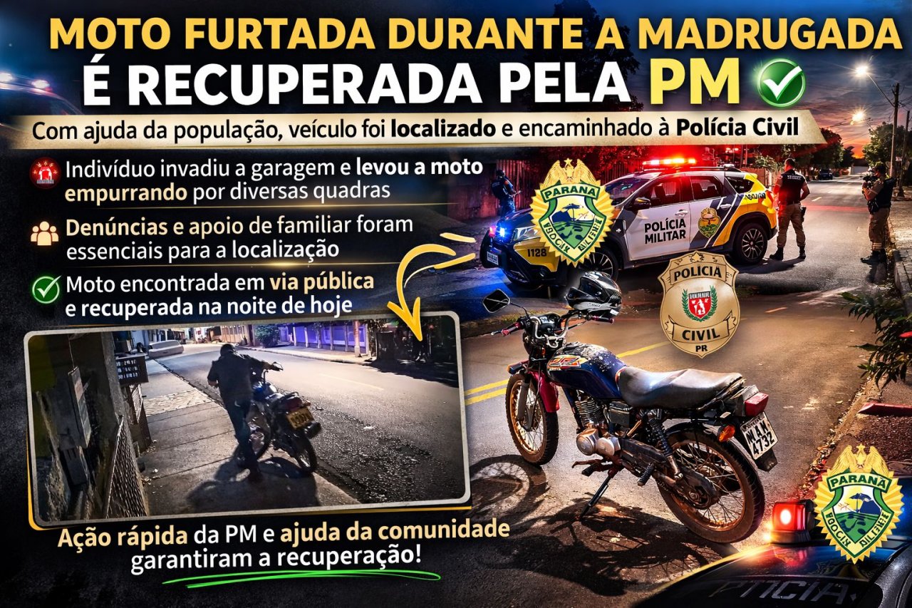Uma motocicleta furtada durante a madrugada foi recuperada na noite desta quinta-feira (26), em Palotina, após mobilização policial e apoio da comunidade.