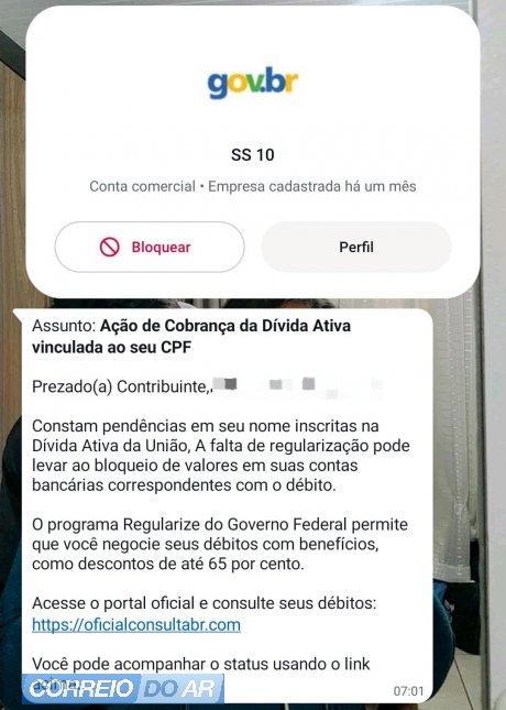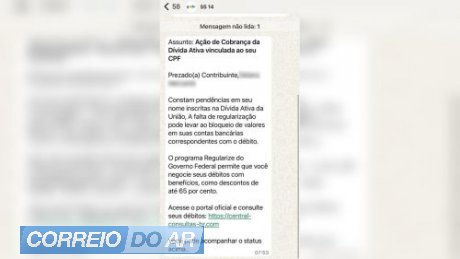 Moradores da região Oeste do Paraná estão sendo alvo de uma nova tentativa de golpe que circula pelo WhatsApp. A mensagem utiliza o nome da Dívida Ativa da União e informa supostas pendências no CPF da vítima, ameaçando bloqueio de contas bancárias caso o valor não seja quitado.