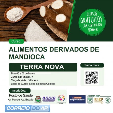 Outro patrimônio contemplado com o Curso de Derivados de Mandioca foi Terra Nova do Piquiri. As inscrições devem ser realizadas no Posto de Saúde. O treinamento será nos dias 5 e 6 de março no Salão da Igreja Católica, das 8h às 17h