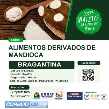 No distrito de Bragantina também acontecerá o Curso de Derivados de Mandioca. As inscrições devem ser efetivas na Subprefeitura e o mesmo acontece nos dias 9 e 10 de março no Salão da Igreja Católica de Bragantina, das 8h às 17h.