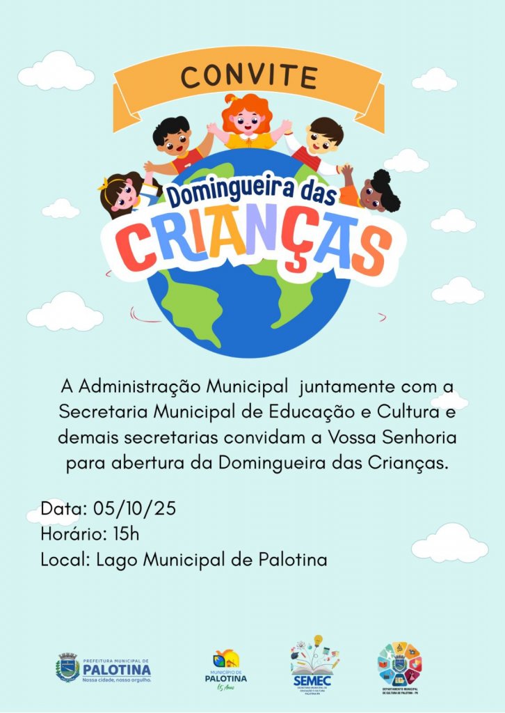 Em comemoração ao Dia das Crianças, a Prefeitura de Palotina promove no próximo domingo, 5/10, a tradicional Domingueira das Crianças, um evento gratuito e cheio de atrações para o público infantil. A festa acontecerá no Lago Municipal, das 15h às 19h, reunindo famílias para uma tarde repleta de brincadeiras, diversão e cultura.