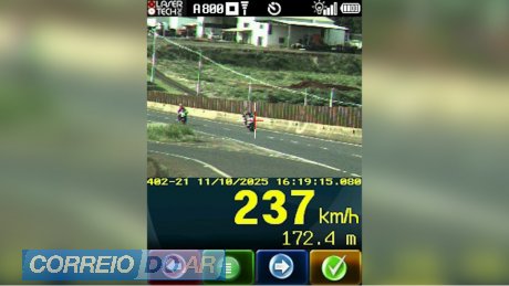 A PRF (Polícia Rodoviária Federal) flagrou uma motocicleta trafegando a 237 km/h na BR-369, em Corbélia no Oeste do Paraná, no sábado (11). O registro foi feito durante uma fiscalização de velocidade realizada pelos policiais rodoviários federais no trecho.