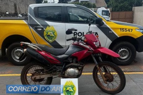 A motocicleta, Honda/NXR 150, Bros, cor vermelha, ano 2011, foi recolhida e encaminhada à sede da Companhia da Polícia Militar para registro da ocorrência.