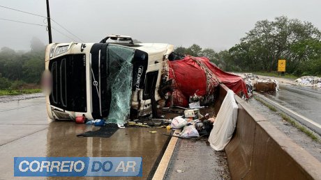 Motorista de carreta morre após tombamento no quilômetro 170 da BR 163, em Lindoeste, na tarde desta quarta-feira (8).