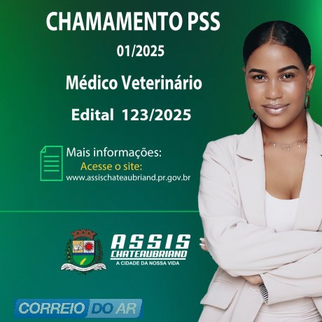 O município de Assis Chateaubriand publicou nesta quarta-feira (24) a convocação de candidatos aprovados em Processos Seletivos Simplificados (PSS) para o cargo de Médico Veterinário. O edital PSS nº 123/2025 publicado no diário oficial, refere-se à 16ª convocação do PSS 01/2025.