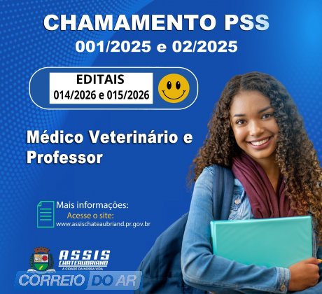 O município de Assis Chateaubriand publicou nesta quinta-feira (5) a convocação de candidatos aprovados no Processo Seletivo Simplificado (PSS) para os cargos de professor e Médico Veterinário. Os editais PSS nº 014/2026 e 015/2026 publicados no diário oficial, referem-se à 24ª convocação do PSS 02/2025 e à 19ª convocação do PSS 001/2025