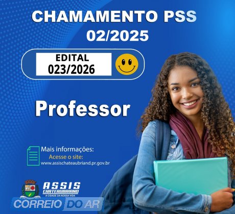 O município de Assis Chateaubriand publicou nesta terça-feira (10) a convocação de candidato aprovado no Processo Seletivo Simplificado (PSS) para o cargo de Professor. O edital PSS nº 023/2026 publicado no diário oficial, refere-se à 28ª convocação do PSS 02/2025.