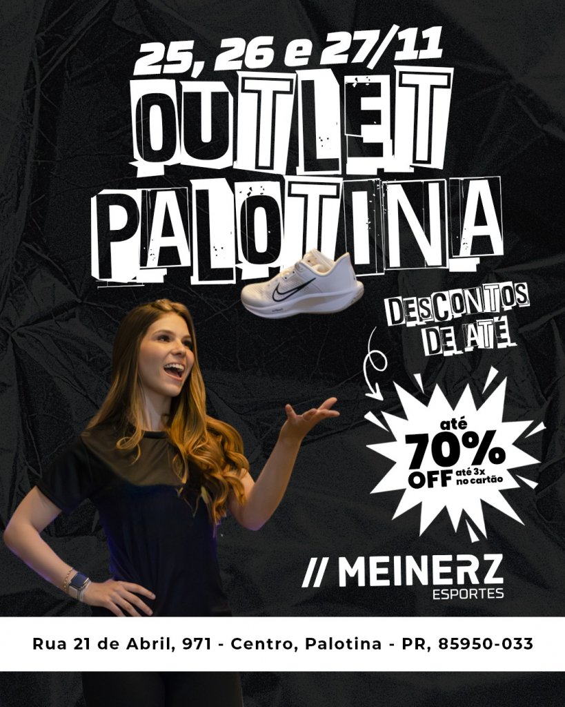 A Outlet Palotina realiza nos dias 25, 26 e 27 de novembro a sua grande Black Friday, com oportunidades imperdíveis e descontos de até 70% em diversas peças.