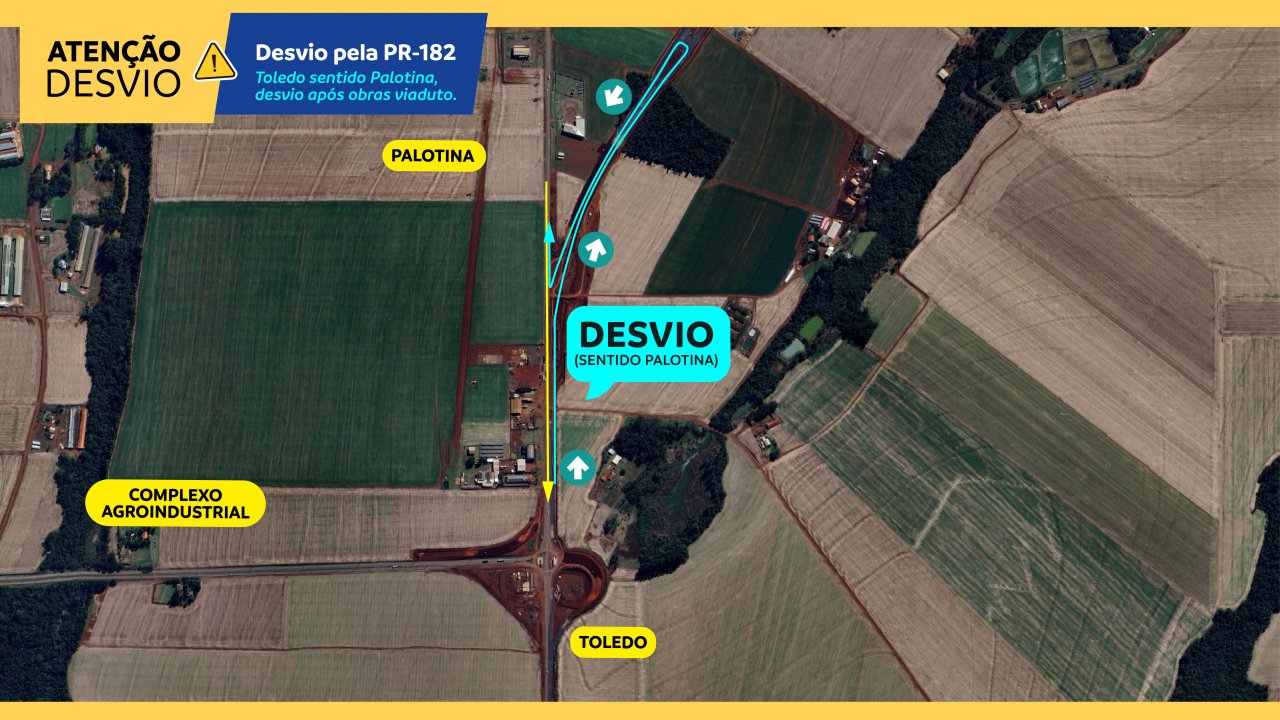 A principal alteração é no sentido Toledo/Palotina. Logo após o viaduto, no trevo da C.Vale, o trânsito será desviado para a lateral e irá seguir até o primeiro retorno do contorno viário.