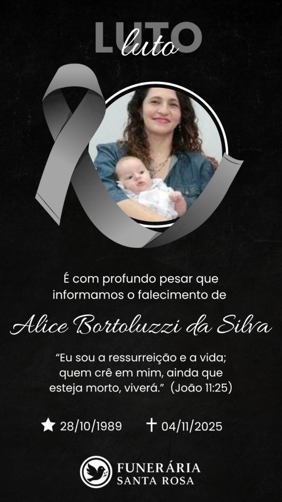 A Funerária Santa Rosa de Palotina comunica, com profundo pesar, o falecimento de Alice Bortoluzzi da Silva, ocorrido nesta segunda-feira (03).