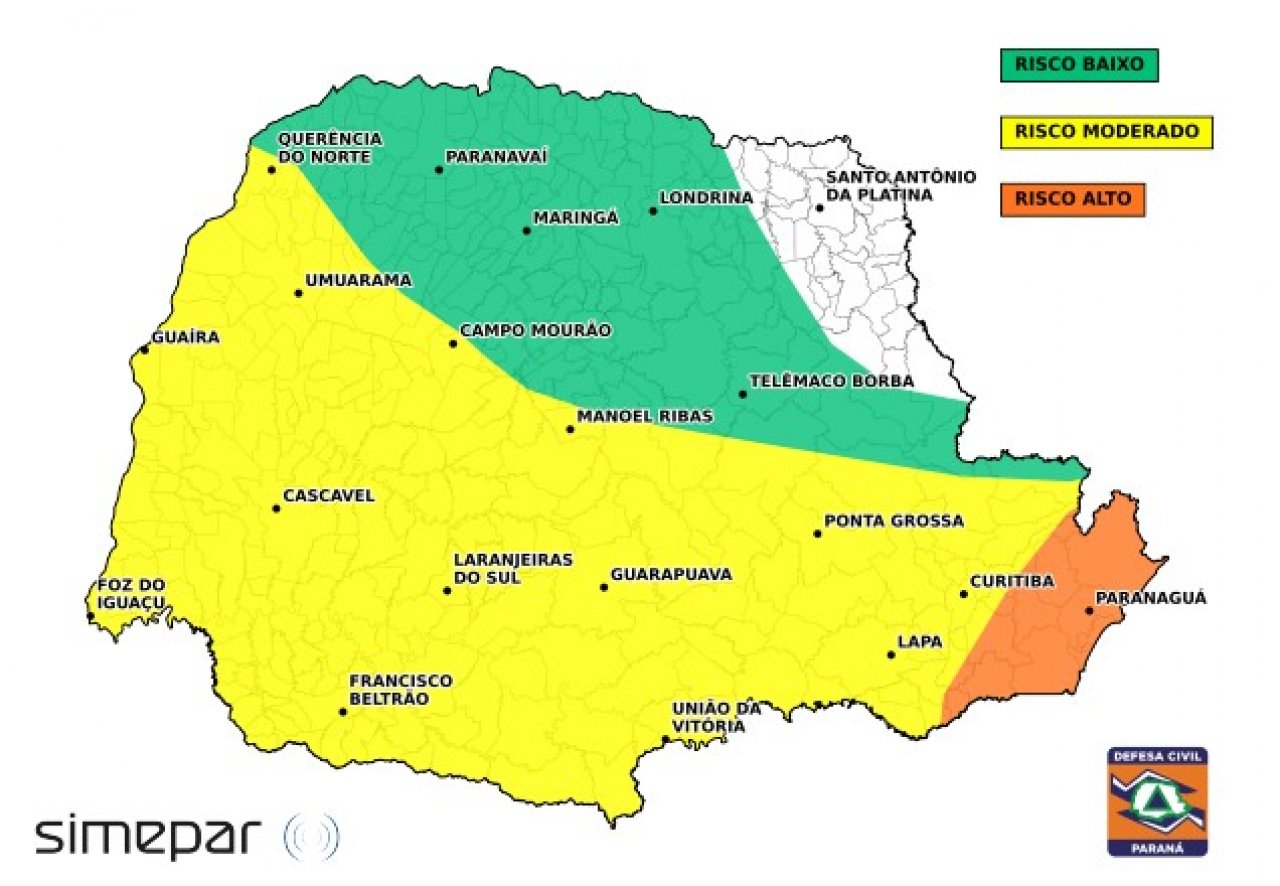 O Simepar alerta para o risco de tempestades pontualmente intensas, com chuva forte em curto espaço de tempo, rajadas de vento mais intensas, descargas elétricas e granizo. Há possibilidade de enxurradas, alagamentos, transbordamento de córregos, destelhamentos, danos em plantações, redução da visibilidade nas estradas e interrupções no fornecimento de energia.