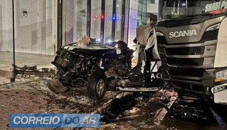 O impacto foi tão forte que o caminhão, mesmo sem carga, chegou a ser deslocado, e uma fachada de sala comercial próxima ao cruzamento foi danificada, com a porta de vidro quebrada.