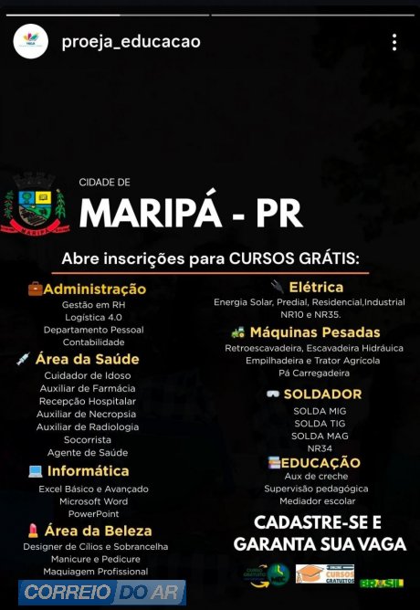 A Prefeitura de Maripá informou que não há inscrições abertas para esses cursos e que a arte não corresponde a nenhuma divulgação oficial da administração municipal, tampouco de secretarias ou programas vinculados ao governo estadual ou federal. Também não existe registro de parceria ativa com instituições que ofereçam as formações mencionadas.