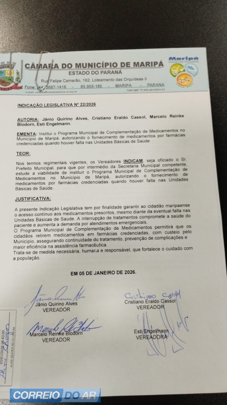 Uma indicação apresentada na Câmara Municipal de Maripá pelo vereador Jânio Quirino Alves, Cristiano Eraldo Cassol, Marcelo Reinke Blodorn e Esti Engelmann propõe a criação de um Programa Municipal de Complementação de Medicamentos.