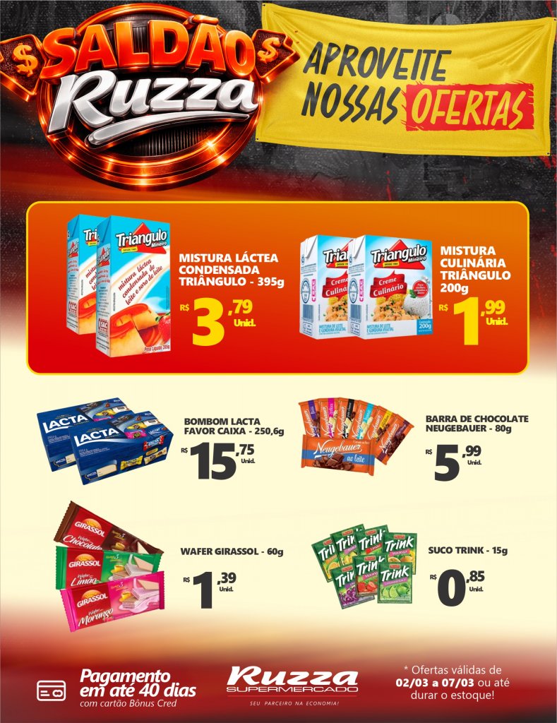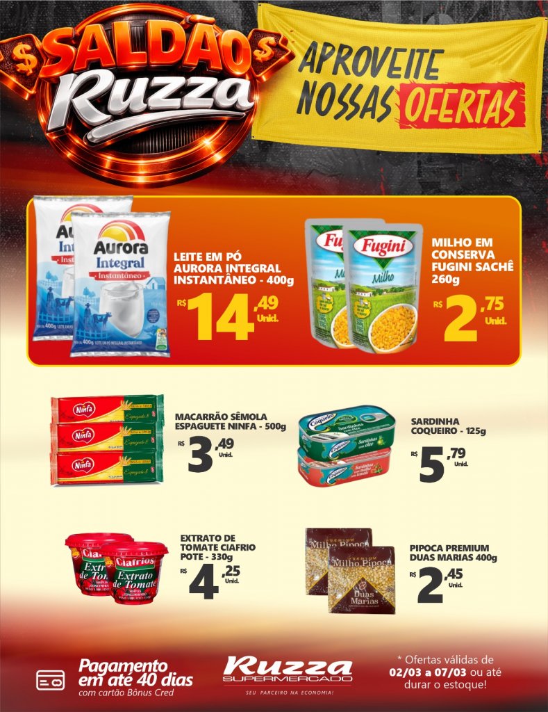 E para quem quer aproveitar ainda mais, o Saldão Ruzza segue com diversas promoções em vários setores da loja. As ofertas do Saldão são válidas de 02/03 a 07/03, ou até durarem os estoques.