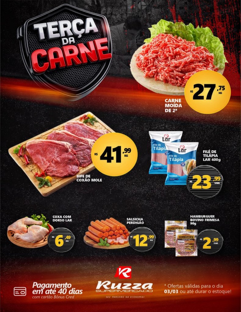A Terça da Carne do Ruzza Supermercado é a oportunidade ideal para quem busca qualidade e economia em um só lugar. As ofertas são válidas exclusivamente para hoje 03/03, ou enquanto durarem os estoques, garantindo condições especiais.