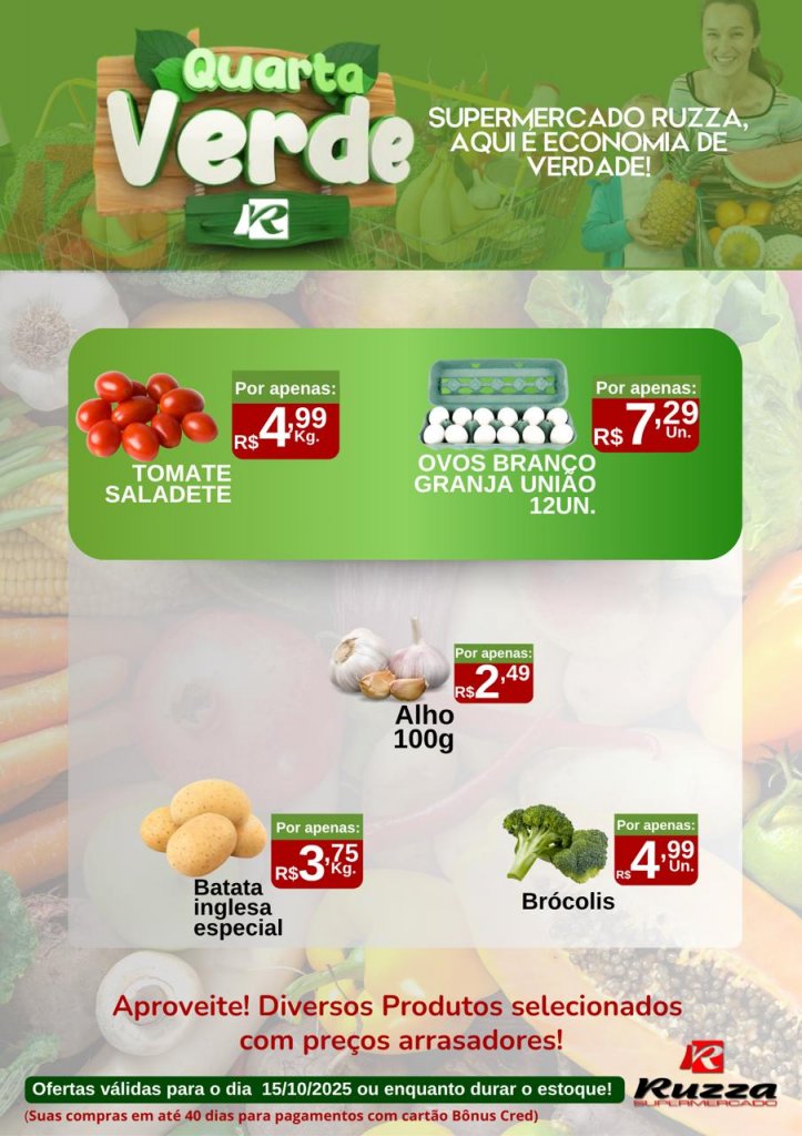 O Supermercado Ruzza de Palotina preparou ofertas especiais para esta quarta-feira (15), é dia de aproveitar a Quarta Verde!