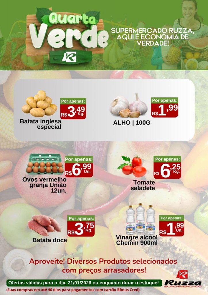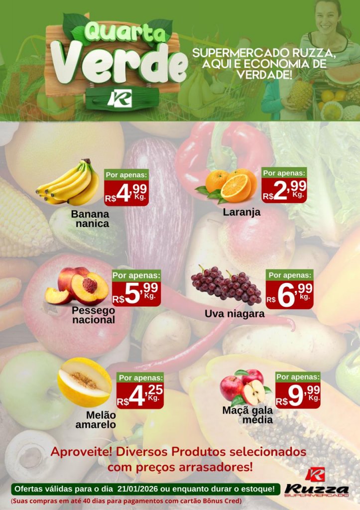 Nesta quarta-feira (21), o Supermercado Ruzza preparou uma nova edição da Quarta Verde — o dia perfeito para quem quer encher a cesta com produtos frescos e de qualidade.