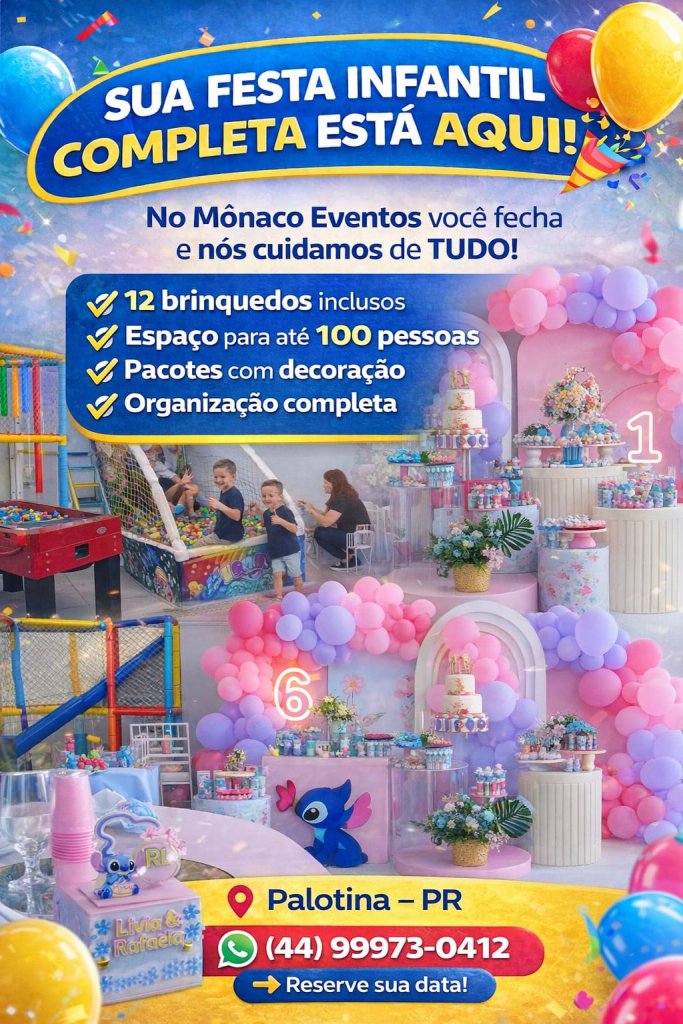 Organizar festa infantil pode ser cansativo. São muitos detalhes e pouco tempo para aproveitar. No Mônaco Eventos, em Palotina, você reserva a data e a equipe cuida de tudo para que o momento seja leve e especial.
