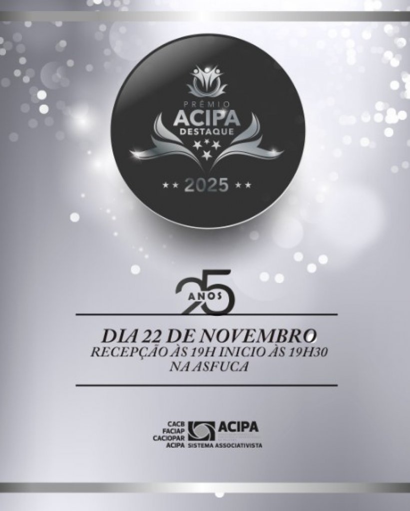 A Associação Comercial, Industrial e Agropecuária de Palotina (ACIPA) realizará, no próximo dia 22 de novembro, a edição especial dos 25 anos do Prêmio ACIPA Destaque, uma das mais tradicionais homenagens do município, que reconhece e valoriza empresas, organizações e personalidades que se destacaram ao longo do ano em seus segmentos.