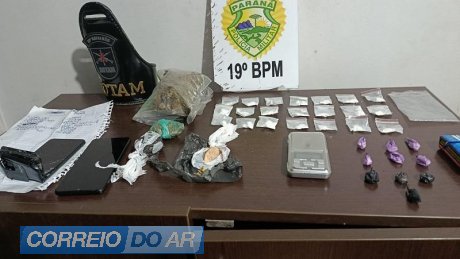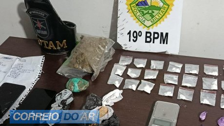 Foram apreendidas 21 buchas de cocaína (21 g), 128 g de maconha em diferentes formas, 17 g de crack, além de balança de precisão, embalagens plásticas e utensílios utilizados para fracionar a droga.
