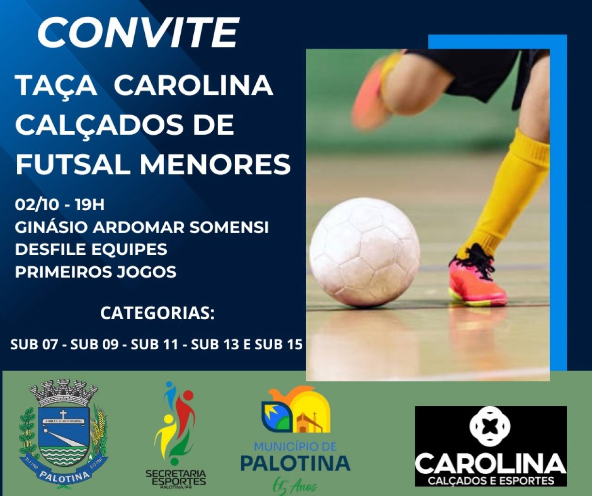 Iniciará nesta quinta-feira (02), a primeira edição da Taça Carolina Calçados de Futsal Menores, numa realização da Secretaria Municipal de Esportes, com apoio da empresa Carolina Calçados. O campeonato contará com a participação de 50 equipes e mais de 500 atletas, divididos nas categorias Sub-07, Sub-09, Sub-11, Sub-13 e Sub-15. Os jogos acontecerão no próprio Ginásio Ardomar Somensi, que receberá crianças e adolescentes de diferentes instituições e projetos esportivos da cidade.