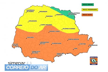 O Boletim de Gestão de Riscos, elaborado pelo Simepar em parceria com a Defesa Civil Estadual, aponta nesta sexta-feira (20) risco alto em toda a metade sul do Paraná para tempestades pontualmente severas com chuva forte em curto espaço de tempo, alagamentos, intensas rajadas de vento, podendo provocar destelhamentos e quedas de galho de árvores.