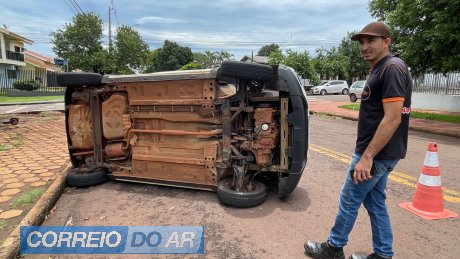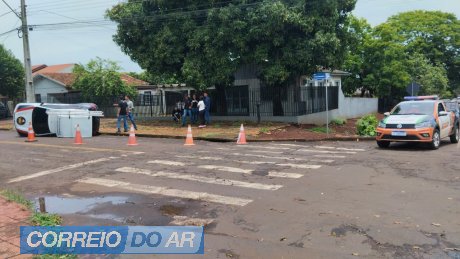 Dois veículos se envolveram na colisão. Com a força do impacto, um Renault Kwid acabou tombando. O condutor sofreu ferimentos leves.