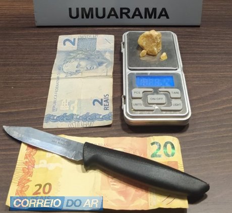 Durante a abordagem, o suspeito tentou se desfazer de objetos, jogando-os no chão. Os itens foram rapidamente recolhidos e identificados como pedras de crack, totalizando 5,3 gramas da droga. Além do entorpecente, os policiais encontraram com o suspeito a quantia de R$ 22,00 em dinheiro e uma faca pequena, com cabo preto, que também foi apreendida.