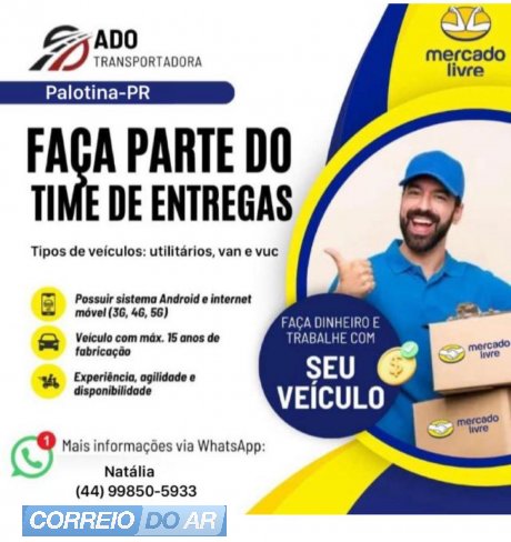 A ADO Transportadora, em parceria com o Mercado Livre, está com cadastro aberto para motoristas interessados em integrar o time de entregas em Palotina (PR). A oportunidade é voltada a profissionais que possuam veículo próprio e disponibilidade para atuar no transporte de encomendas.
